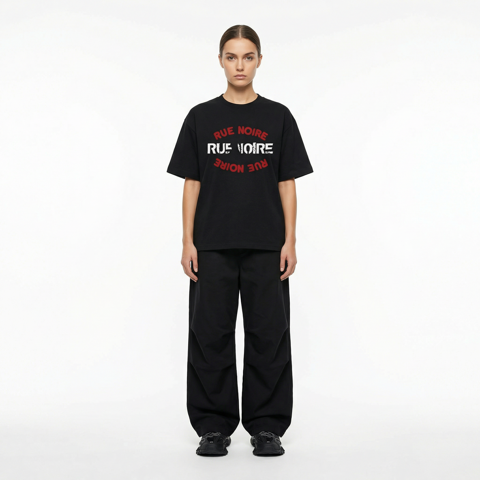 T-shirt streetwear Rue Noire realizzata in 100% cotone italiano e prodotta interamente in Italia. Il design è definito dalla stampa frontale con logo circolare, che esprime un’estetica urbana essenziale, ispirata al lato più autentico della strada, mantenendo uno stile pulito e versatile.